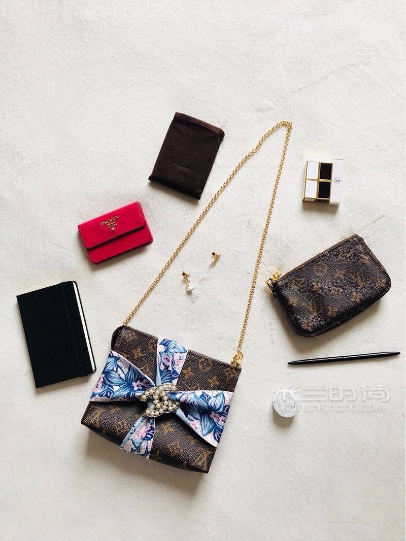 Poche toilette 19cm,最近盥洗包很红啊,我原本也是买来做化妆包或者包内收纳的,当时的Sa建议我买26的,价格差距不大,可以拿来做手包,但我160,拿26的觉得好大,穿衣搭配没有那种帅的感觉,还是选了小的。盥洗包的设计的拉链下方不是封闭的,所以可以改造成个小挎包,上一翩好多小姐姐问我,丝巾怎么穿过去,其实就是从拉链下面过去的,大家可以看到图中,lv的拉链很顺滑,并没有发现会夹到丝巾的时候,如果怕自己比较大意的姑娘,可以用皮筋把拉链下的那段扎起来,就不会夹到,直接丝巾穿过去,可以在肩膀处打个蝴蝶结,夏天配单色连衣裙很好看;我喜欢链子和丝巾一起搭配,链子若隐若现,丝巾不用穿过包下,也就解决了怕夹到丝巾的问题;加个长链就可以斜挎,这个包也是很能装,手机,墨镜都不成问题;只用丝巾还可以当手包,一包多用,喜欢。