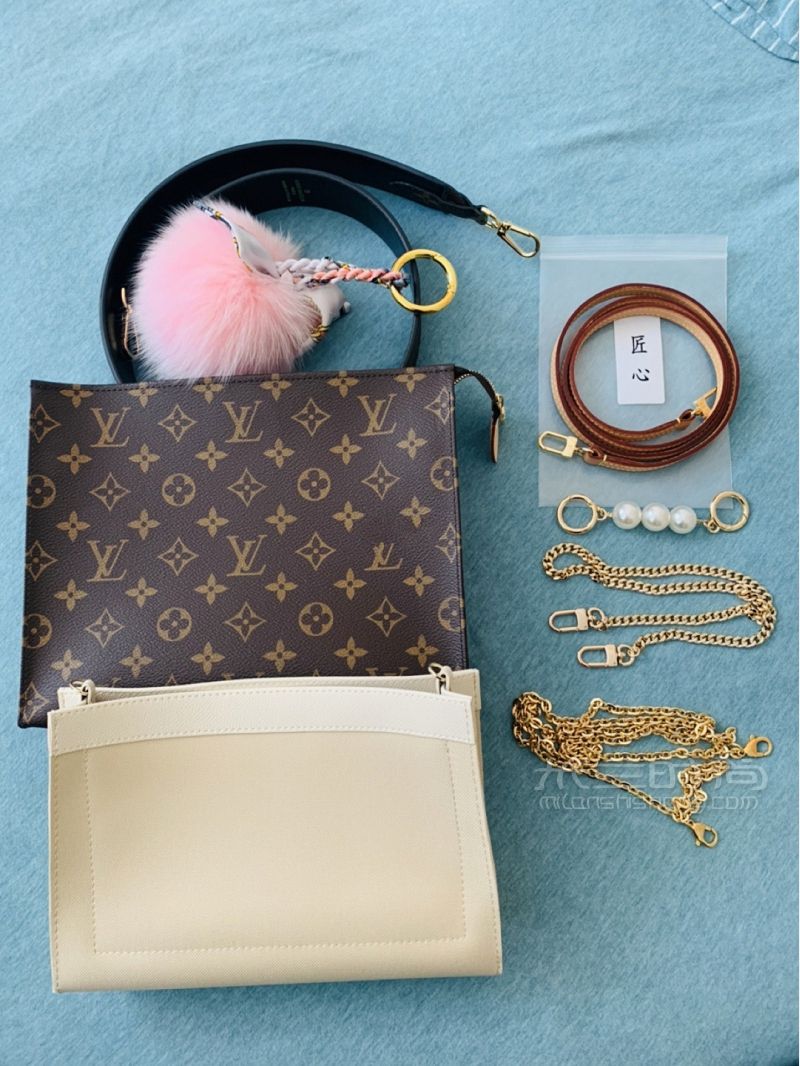 有姐妹让我详细的说一下怎么改造手拿包,今天得空详细的拍了几张图片给姐妹们说说。就拿LV的洗漱包26为例,我把可以搭配它的几根链条肩带都拿出了(图一)。