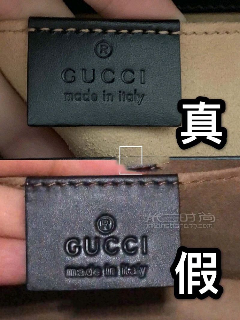 3 正品则不会出现这样的情况,皮牌GUCCI标志压印清晰,压纹的深浅一致,字体清晰,工整精致。[萌萌哒R] 仿品的油边溢出比较严重,看起来很不美观。